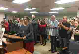 Pam Acevedo speaks to a crowd of nearly 60 people covering the topic of a request to remove the Ten Commandments from city owned property in Hobbs, N.M. Acevedo began a Facebook group called Freedom FOR Religion that has grown to more than 1,000 members in two days. The group peacefully marched around City Hall, stopping at all four corners to commence in prayer.
