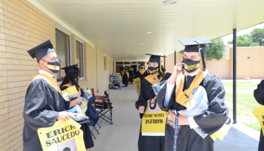 Wearing his golden honor graduate robe, Devin Adame was the first Hobbs High School graduate to walk through the doorway. You couldn’t see his smile behind the Hobbs Eagles mask he wore, but anyone could see the relief in his eyes. He was the first of the Class of 2020 to walk across the front of Tydings Auditorium’s “stage” Saturday …